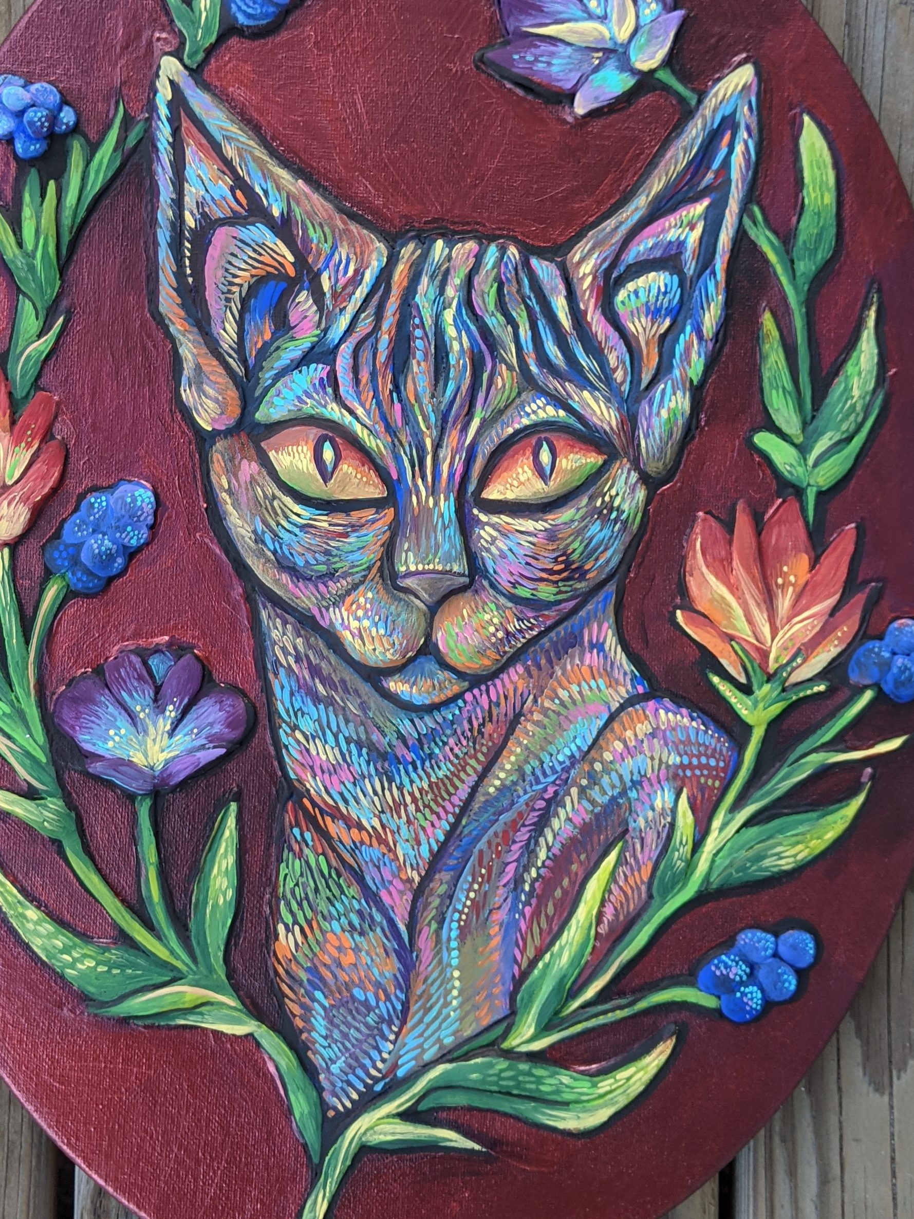 is a Fredericton-based visual artist and art educator whose work combines acrylic mediums and sculptural elements to develop tactile paintings. Working in bright colors with floral and fantasy elements, he weaves his experiences as a queer immigrant into his work.